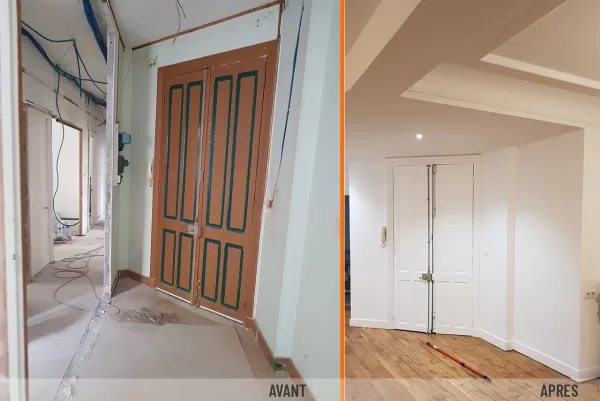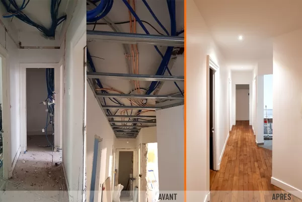 - Plâtrerie: Mise en place d’un faux plafond avec des spots intégrés dans le couloir