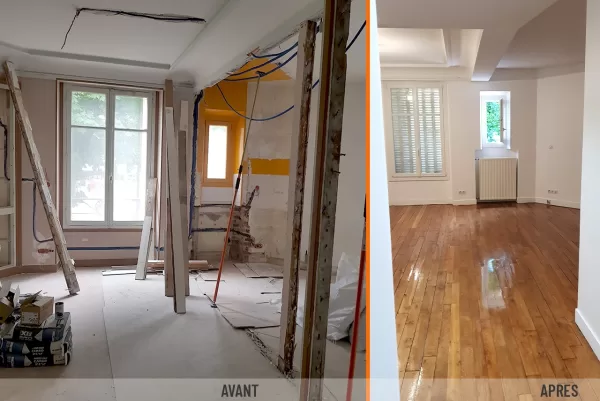 - Revêtement de sol: Ponçage de l’ancien parquet, rénovation du parquet au lieu des cloisons démolis