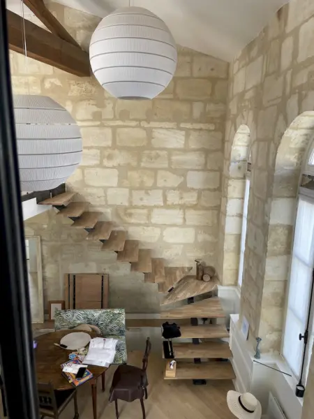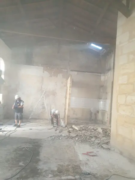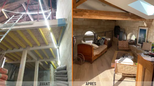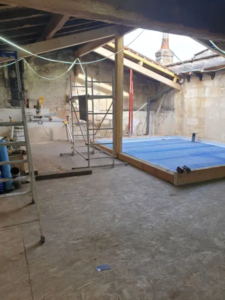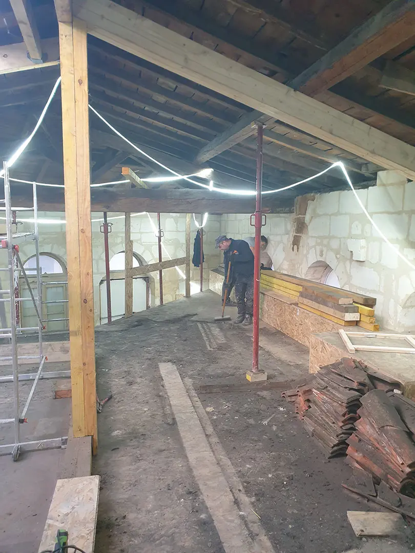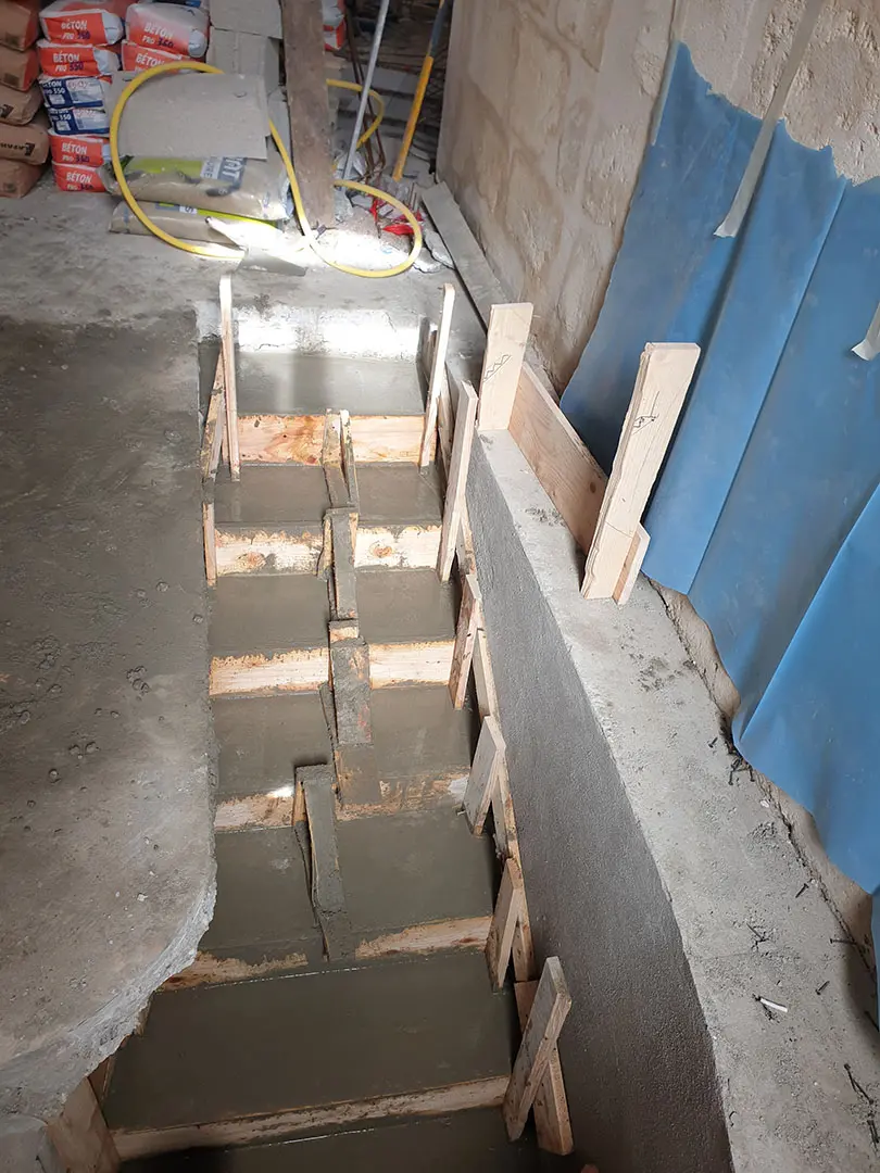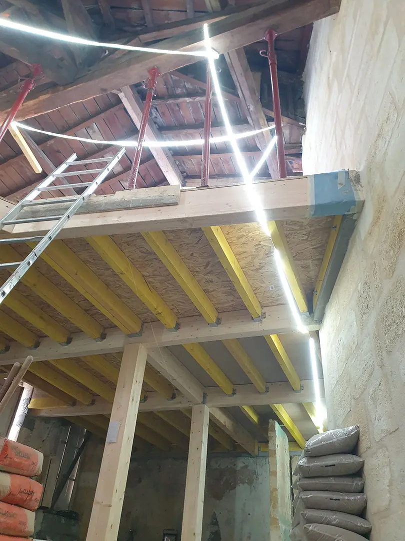 - Maçonnerie: Ouverture pour escalier vers la cave. Création d’une mezzanine en bois.